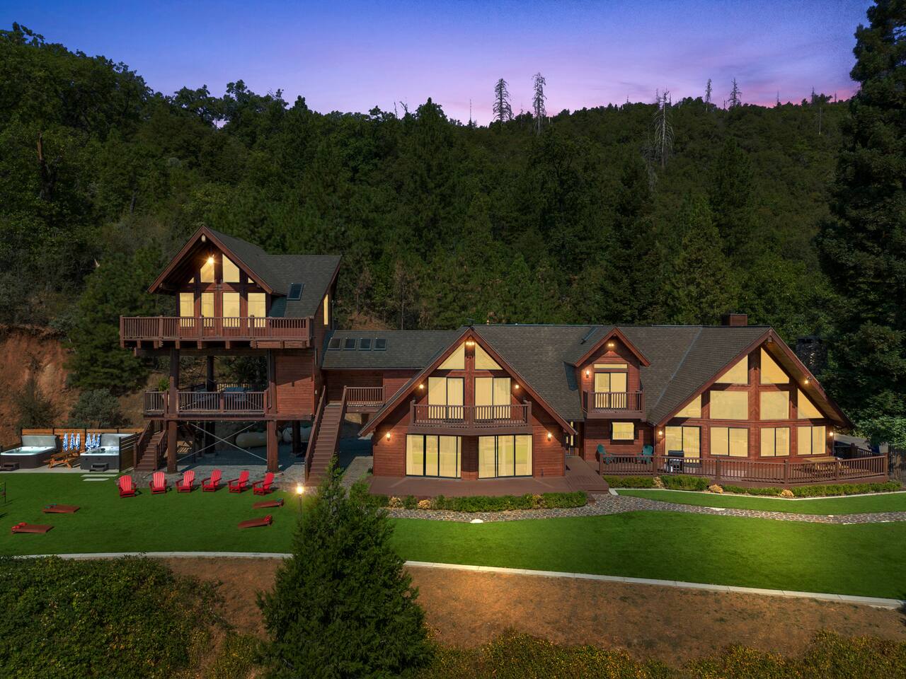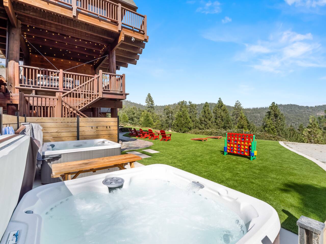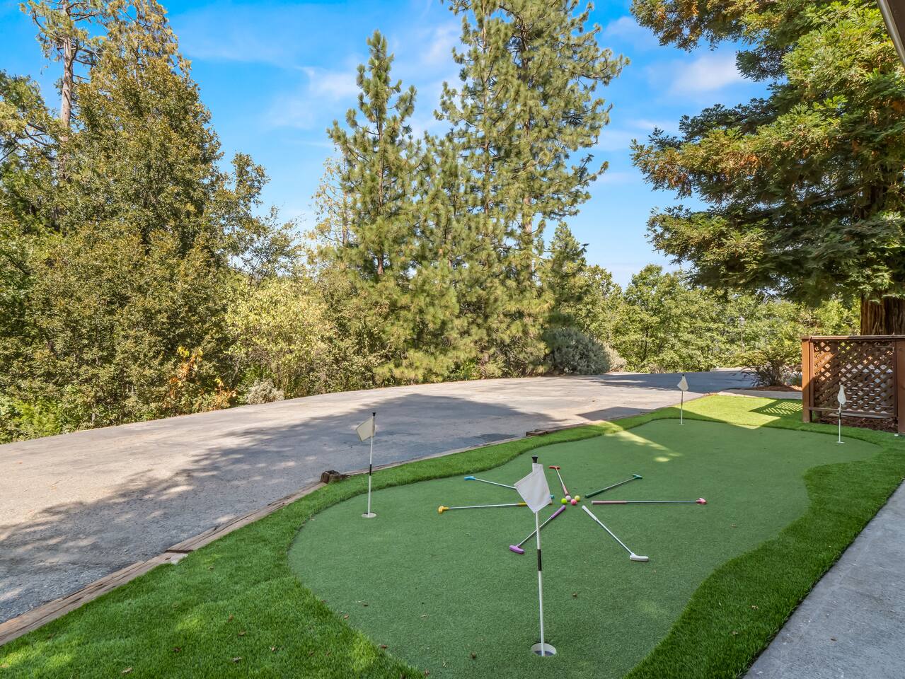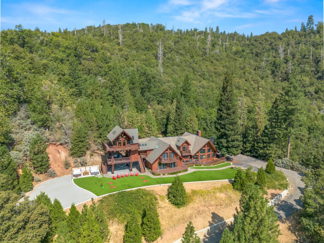 ABOUT THE PROPERTY: ✦ 4400 sq ft custom A-Frame Cabin ✦ Sleeps 20 max (including children) in 5 bedrooms ✦ 3 full bathrooms KEY FEATURES: ✦ 2 Fire Pits - Wood and Propane ✦ 2 Hot Tubs ✦ Putting Green ✦ Pool Table ✦ BBQ ✦ Starlink ✦ Cornhole ✦ 55" Roku Smart TV with apps such as Netflix, Amazon, Hulu, etc. ✦ Backup Generator to ensure your comfort during power outages ✦ Woodburning fireplace ✦ Wood stove ✦ Direct access to 300,000+ acres of national forest ✦ Pets allowed with an additional fee of $150 per pet. ✦ Kid friendly essentials: Pack 'n Play and high chair ✦ 3 King beds & 6 queen beds DISTANCE TO LOCAL ATTRACTIONS: ✦ Yosemite South Gate Entrance - 23 miles ✦ Mariposa Sequoia Grove - 26 miles ✦ Bass Lake - 6 miles ✦ Sugar Pine Railroad - 20 miles ✦ Lewis Creek Trail - 14 miles ✦ Oakhurst - 11 miles ✦ North Fork - 8 miles TRANSPORTATION: ✦ Fresno Airport (FAT) - 45 miles WHAT TO EXPECT: ✦ Sound travels far, and although we sit on 8 acres, please be respectful of your noise levels at all times throughout the day and especially during quiet hours so our neighbors can enjoy the peaceful area they live in. Please abide by Madera County Noise Ordinance regulations 9.58.020 "Residence. It shall be unlawful for any person to make, continue, or cause to be made or continued, any disturbing, excessive or offensive noise which causes discomfort or annoyance to reasonable persons of normal sensitivity residing in the area." This quote is valid during all times of the day. ✦ We suggest bringing a 4x4 or chains in the winter (October-March) ✦ We are out in nature and back up to 300,000 acres of national forest, resulting in wildlife and critters that are occasionally around the property ✦ Partying, smoking, and any violation of the house rules will result in a $1,000 charge and possible removal from the property ✦ We always suggest getting travel insurance for those "life happens" moments ✦ The house has huge windows so cooling the home can be difficult ✦ You may encounter wildlife such as deer and even bears. Please remove all food from your vehicles, close and latch outdoor trash bins, and keep an eye on any pets you may have with you. ✦ The driveway is narrow and somewhat bumpy