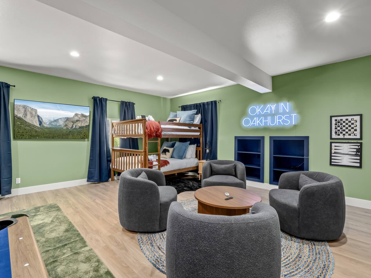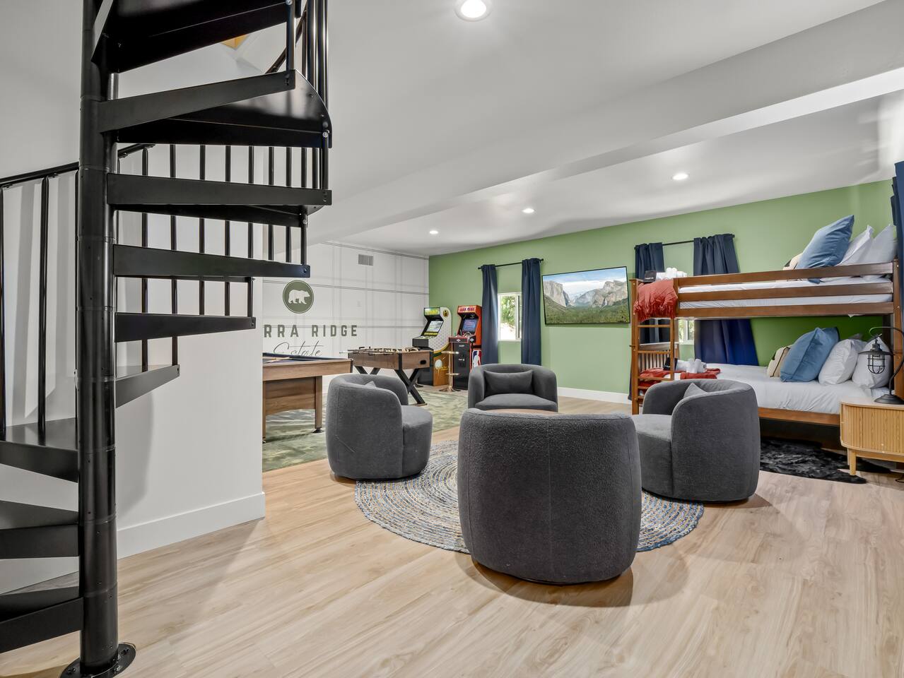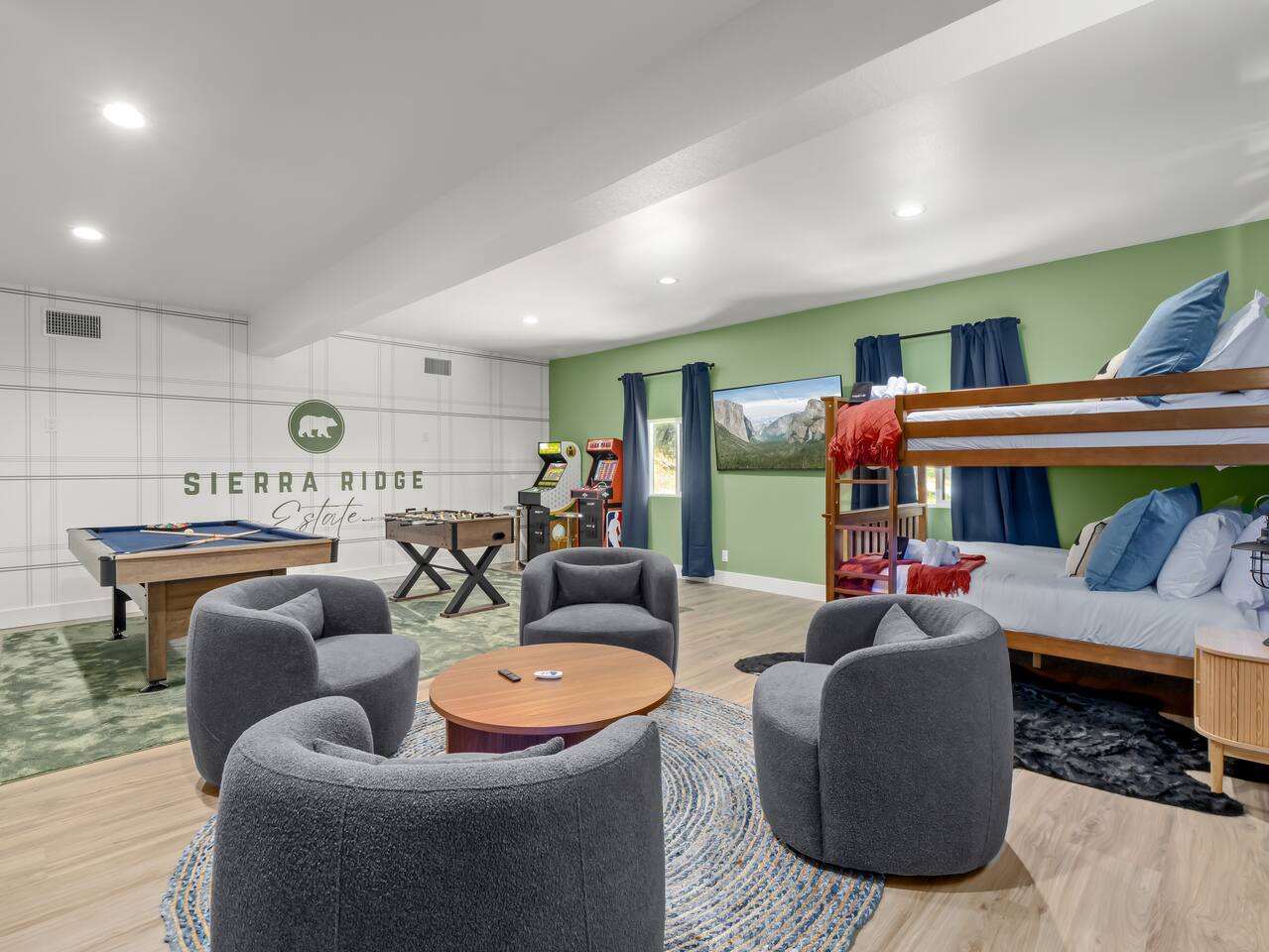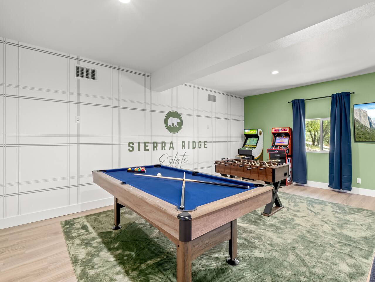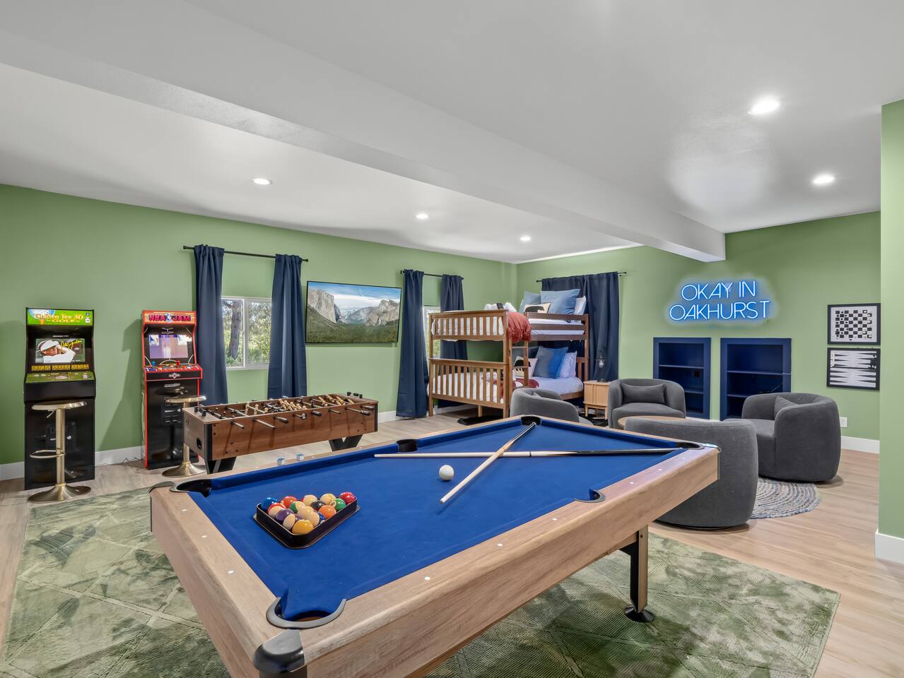 Home sleeps 26 with 7 bedrooms & 4 baths. Experience Yosemite at Sierra Ridge Estate! This professionally designed home is set on 8 scenic acres, and is perfect for up to 26 guests and is ideal for family reunions, work retreats, or vacations with friends. Just 25 mins to Yosemite’s south gate entrance, 10 mins to Bass Lake, & 11 mins to Oakhurst! FEATURES: ✦ Indoor Pickleball Court ✦ Fire Pit ✦ Hot Tub ✦ BBQ ✦ Pet friendly ✦ Movie Theater ✦ Pool Table, Foosball, Arcade Games