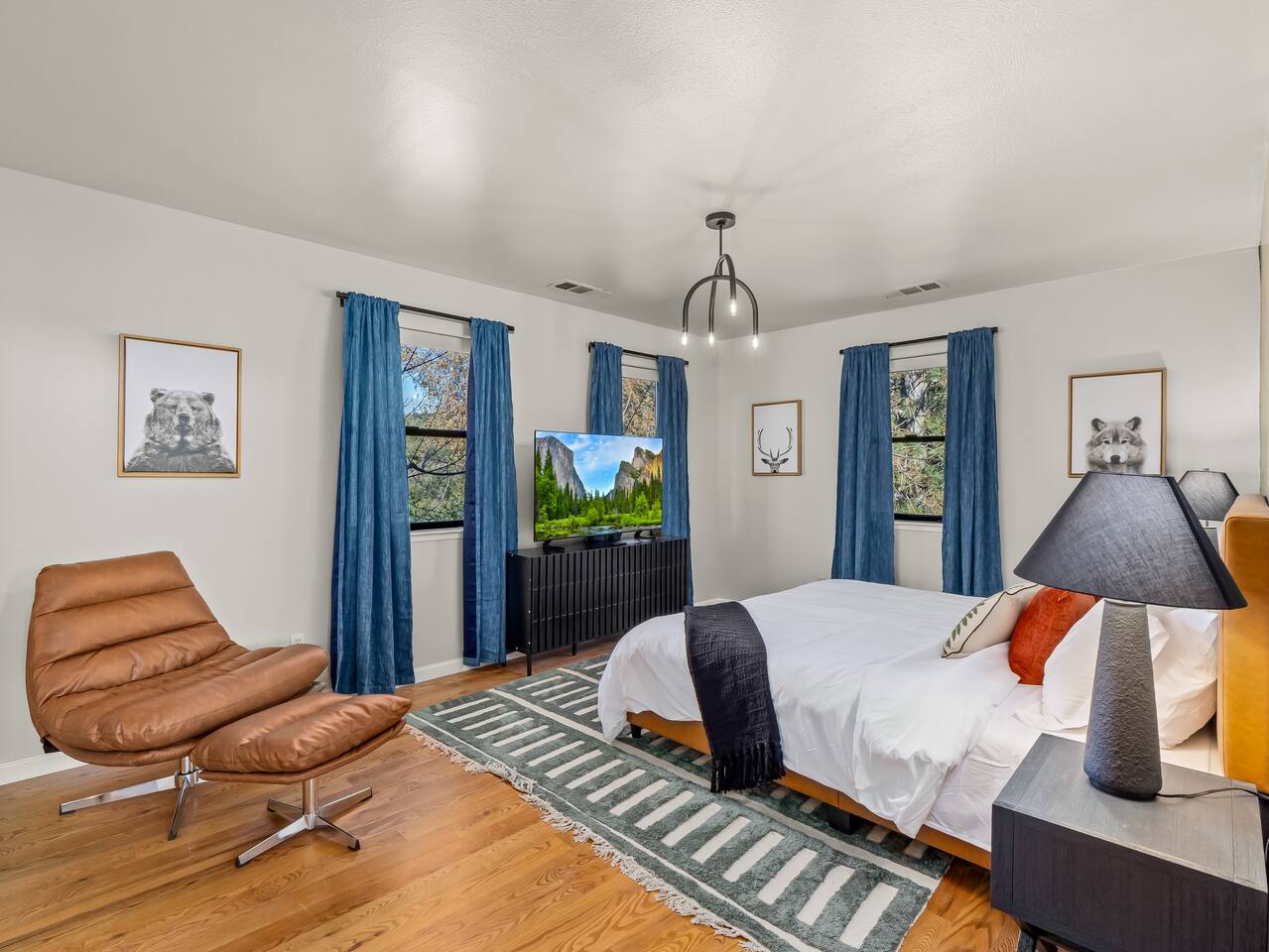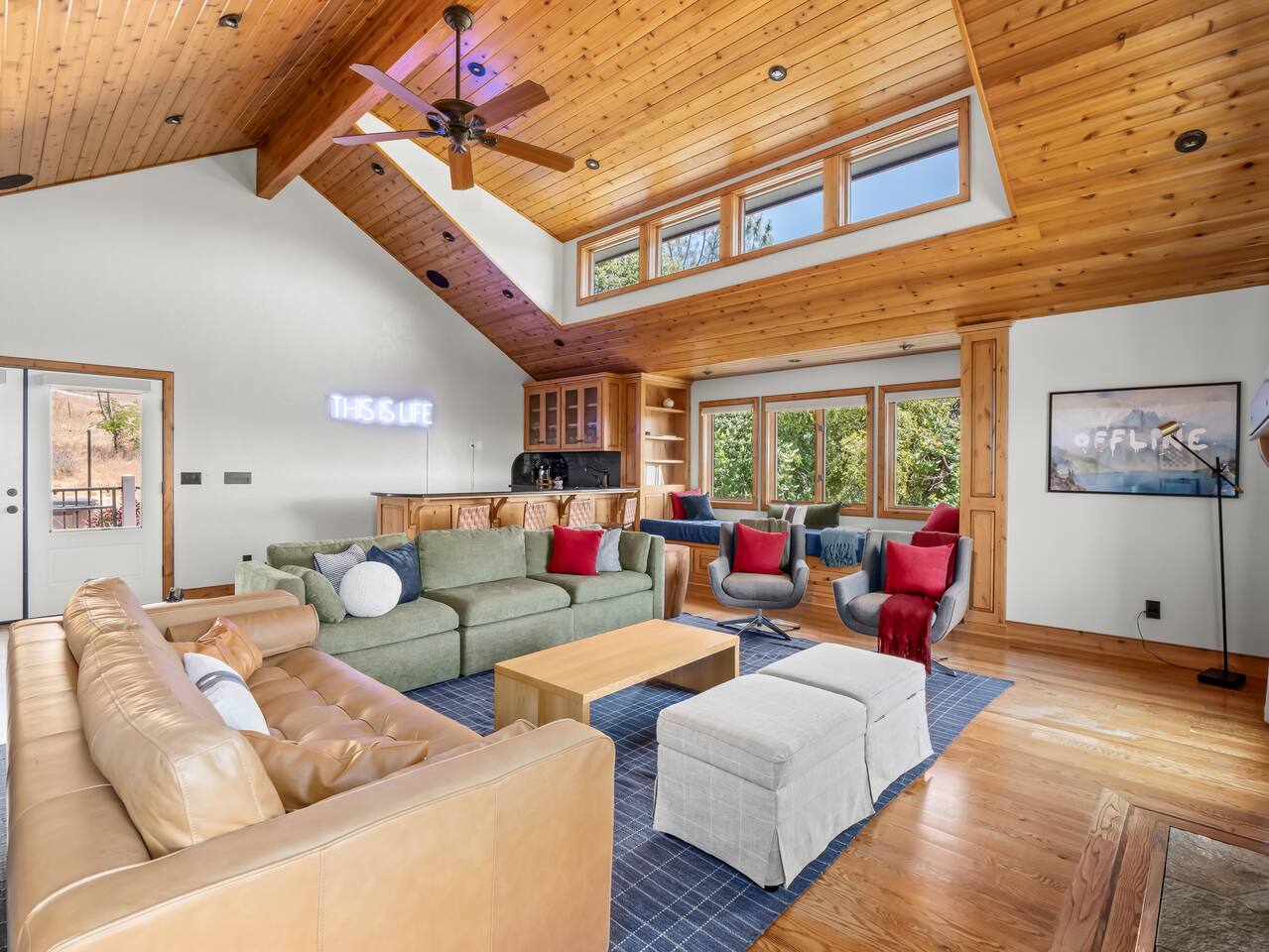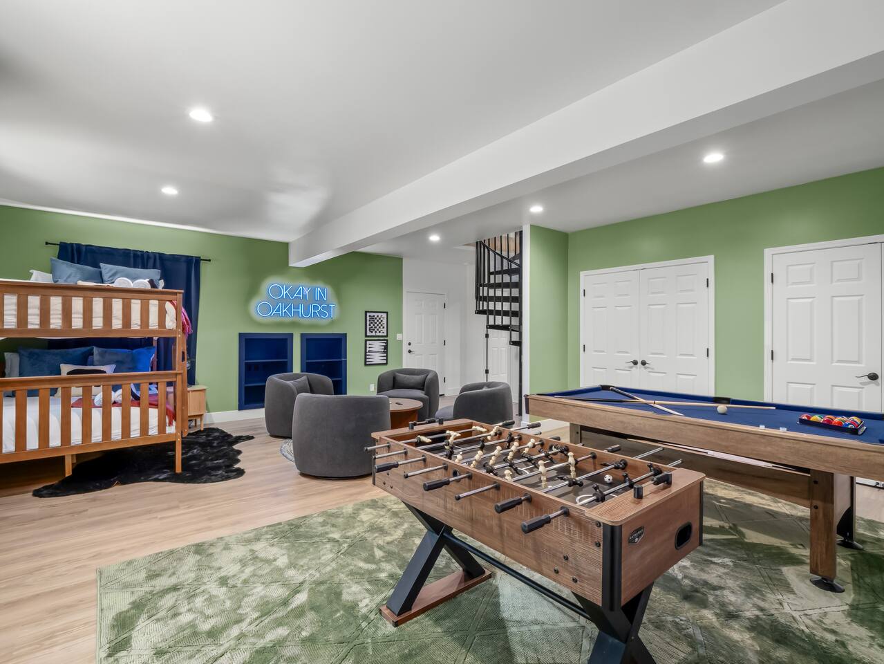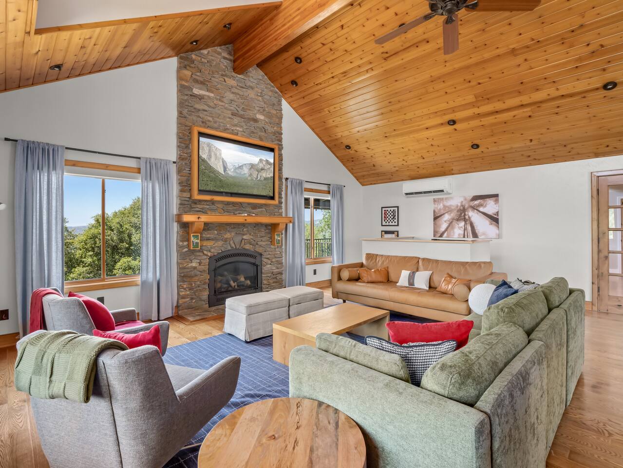 Home sleeps 26 with 7 bedrooms & 4 baths. Experience Yosemite at Sierra Ridge Estate! This professionally designed home is set on 8 scenic acres, and is perfect for up to 26 guests and is ideal for family reunions, work retreats, or vacations with friends. Just 25 mins to Yosemite’s south gate entrance, 10 mins to Bass Lake, & 11 mins to Oakhurst! FEATURES: ✦ Indoor Pickleball Court ✦ Fire Pit ✦ Hot Tub ✦ BBQ ✦ Pet friendly ✦ Movie Theater ✦ Pool Table, Foosball, Arcade Games